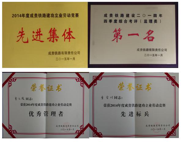 公司成貴監(jiān)理項目部在業(yè)主(成貴鐵路有限責(zé)任公司)組織的2014年度建功立業(yè)勞動競賽評比活動中獲得先進(jìn)集體榮譽,李文俊、李宗付同志喜獲優(yōu)秀管理者、先進(jìn)標(biāo)兵稱號。